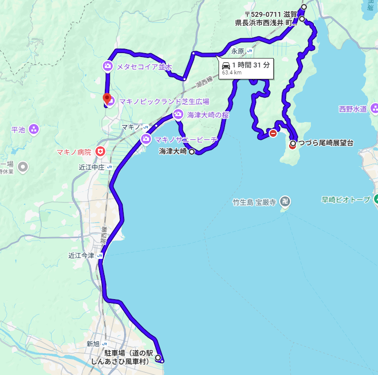 海津大崎と奥琵琶湖パークウェイの桜を眺めながら走り、展望台の駐車場で写真を撮影し、下りてメタセコイア並木道へ向かう春の景色を楽しむショートツーリングです。